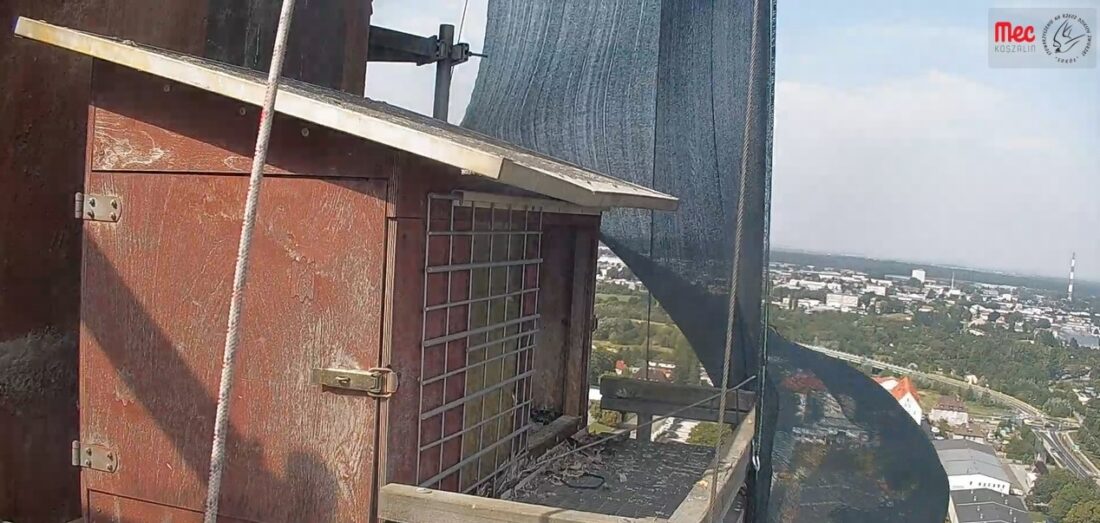 Do niecodziennego zdarzenia doszło podczas trwającego remontu komina naszej ciepłowni przy ul. Słowiańskiej w Koszalinie – jedno z narzędzi, którymi posługują się ekipy remontowe, upadło na daszek i barierkę budki sokołów, uszkadzając je. Wkrótce budka zostanie naprawiona.